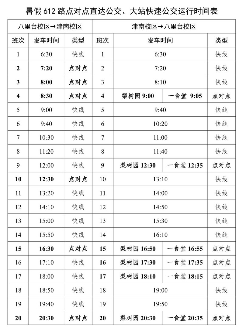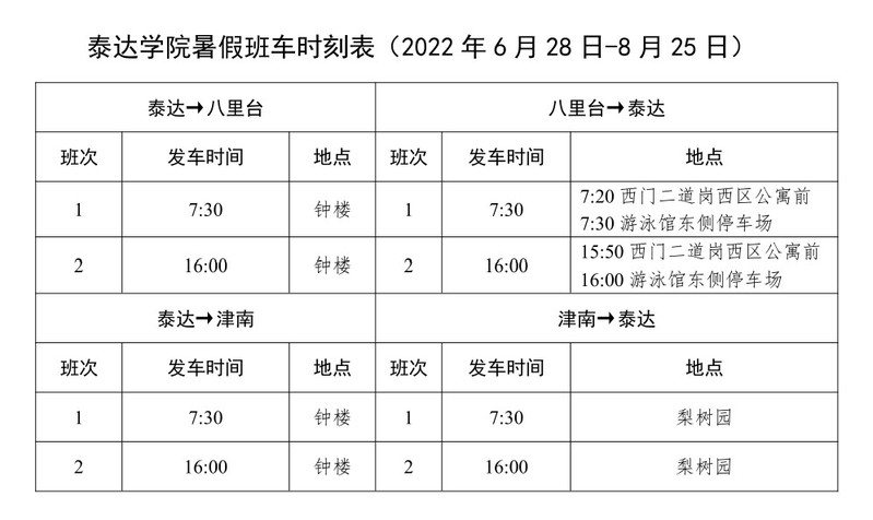 1.泰達(dá)與八里臺(tái)、津南校區(qū)通勤班車自2022年6月28日(周二)至8月25日(周四)按照假期班車方案運(yùn)行,具體班次為: